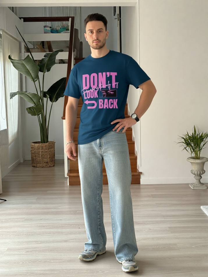 The GenZudio Don’t Look Back oversized tee blends bold neon-pink typography with a stylish eye illustration, creating a modern streetwear statement piece. Designed in deep navy blue, this relaxed-fit tee delivers comfort, attitude, and standout visual appeal — perfect for trendsetters and motivated mindsets.