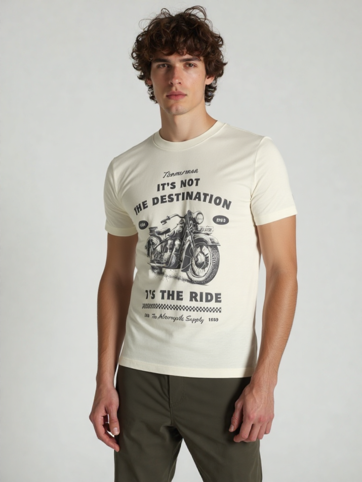 The GenZudio It’s Not the Destination, It’s the Ride T-shirt features a beautifully detailed vintage motorcycle illustration paired with bold retro typography. Designed in a classic ivory base, this tee blends biker culture with timeless style.