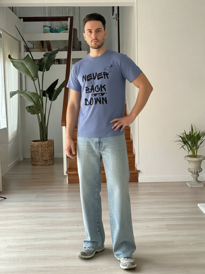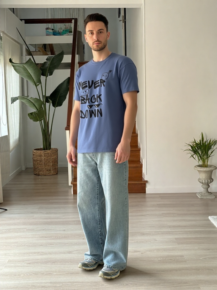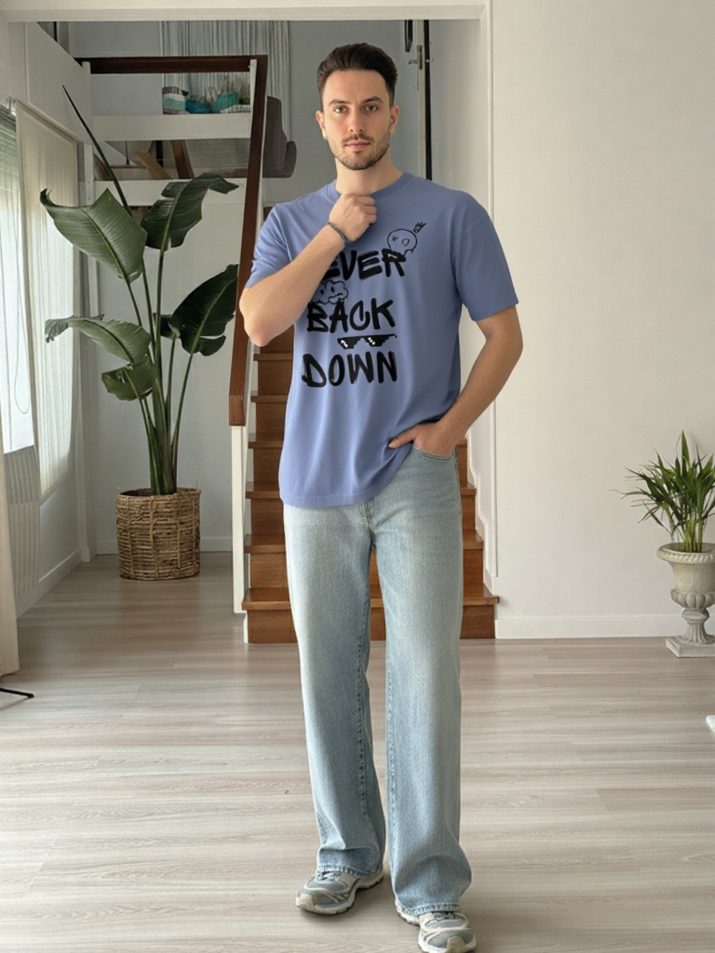 The GenZudio Never Back Down oversized tee features a fun doodle-style graphic blended with a strong motivational message. Designed in a relaxed oversized fit, this steel grey tee adds personality and confidence to every outfit.