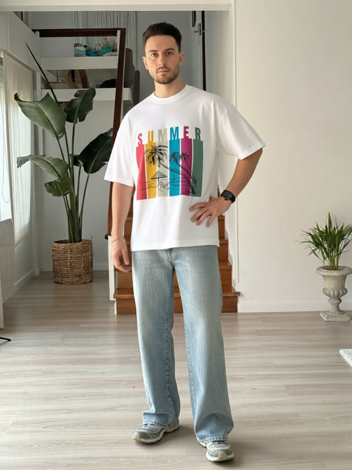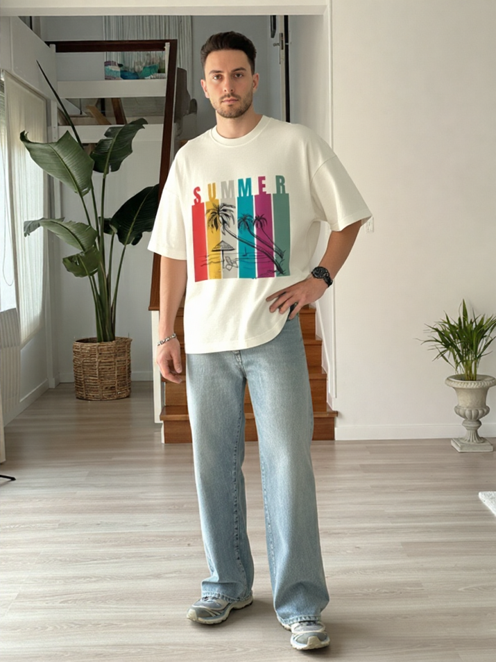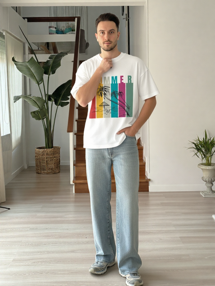 Step into sunshine vibes with the Summer Retro Beach Paradise Premium Oversized T-Shirt, crafted for those who live for the breeze, the waves, and the good days. Featuring a vibrant multicolour retro beach print with palm trees, sailboats, and relaxing holiday aesthetics, this tee blends chill comfort with standout style. Perfect for vacations, outings, streetwear looks, and those who carry the summer spirit all year round.